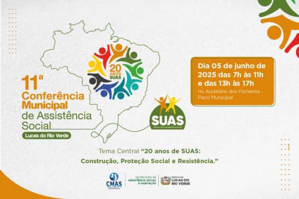 A Prefeitura de Lucas do Rio Verde, por meio da Secretaria de Assistência Social e Habitação, realizará a 11ª Conferência Municipal de Assistência Social no dia 05 de junho. O evento ocorrerá no Auditório dos Pioneiros, localizado no Paço Municipal, a partir das 7h, com credenciamento e café da manhã de boas-vindas.