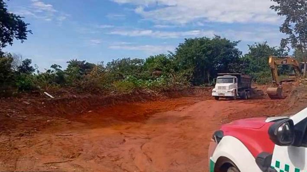 Dois homens foram flagrados retirando aterro do terreno. Eles utilizavam um caminhão-caçamba e uma retroescavadeira A Prefeitura de Várzea Grande, por meio da Guarda Municipal,