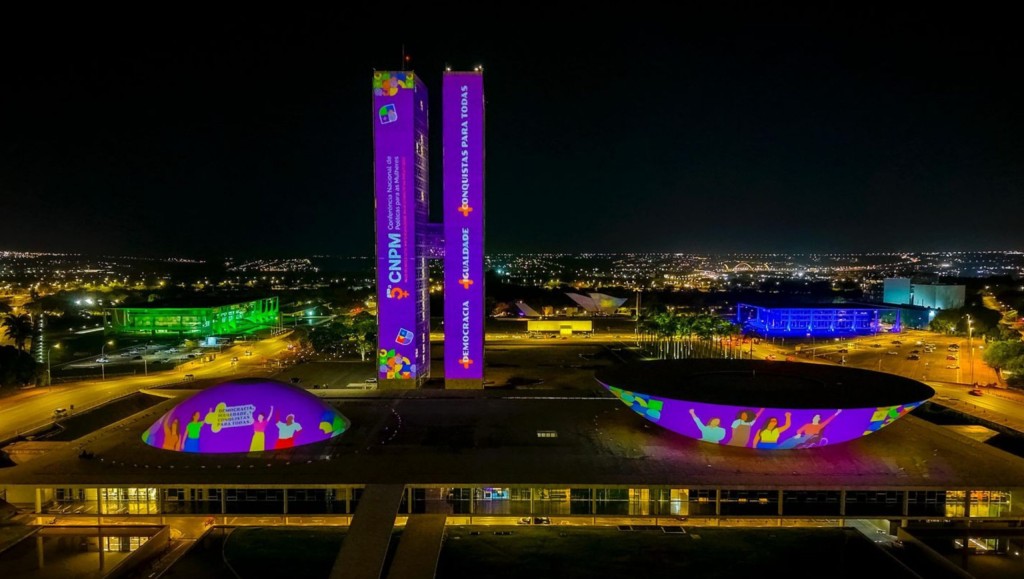 Na noite desta sexta-feira (26), o Congresso Nacional foi iluminado pela projeção da 5ª Conferência Nacional de Políticas para as Mulheres (5ª CNPM), promovida pelo