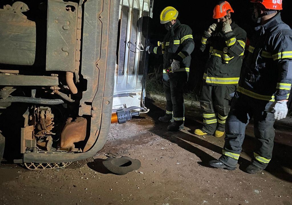 Bombeiros realizam desencarceramento de vítima e resgate de bois após caminhão tombar em rotatória