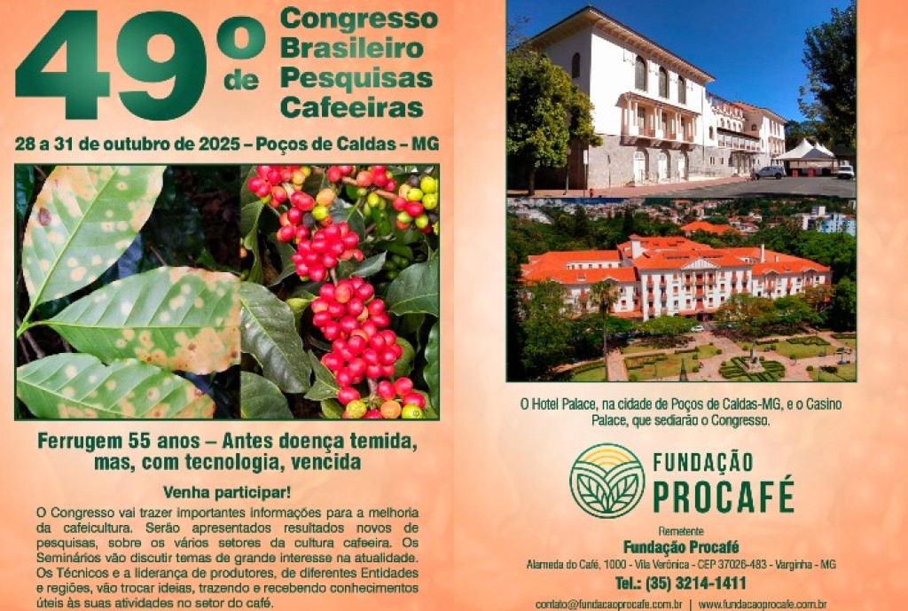 O 49º Congresso Brasileiro de Pesquisas Cafeeiras terá como tema central os 55 anos do combate à ferrugem do cafeeiro, doença que marcou a história da cafeicultura nacional. Com o slogan “Ferrugem do Cafeeiro 55 anos: antes doença temida, hoje vencida pela tecnologia”, o evento reforça a evolução da produção de café no Brasil desde o surgimento da ferrugem em 1970, que impulsionou a modernização das lavouras e o uso de tecnologias avançadas no setor.