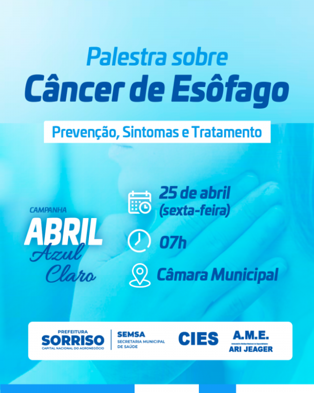 A Câmara Municipal será palco nesta sexta-feira, (25) de mais uma importante ação de saúde para o Município. A partir das 7h, o público em geral vai poder prestigiar uma palestra sobre a Campanha Azul Claro, que alerta para o Câncer de Esôfago. O evento abordará a prevenção e conscientização sobre um dos cânceres com mais alta taxa de mortalidade.
