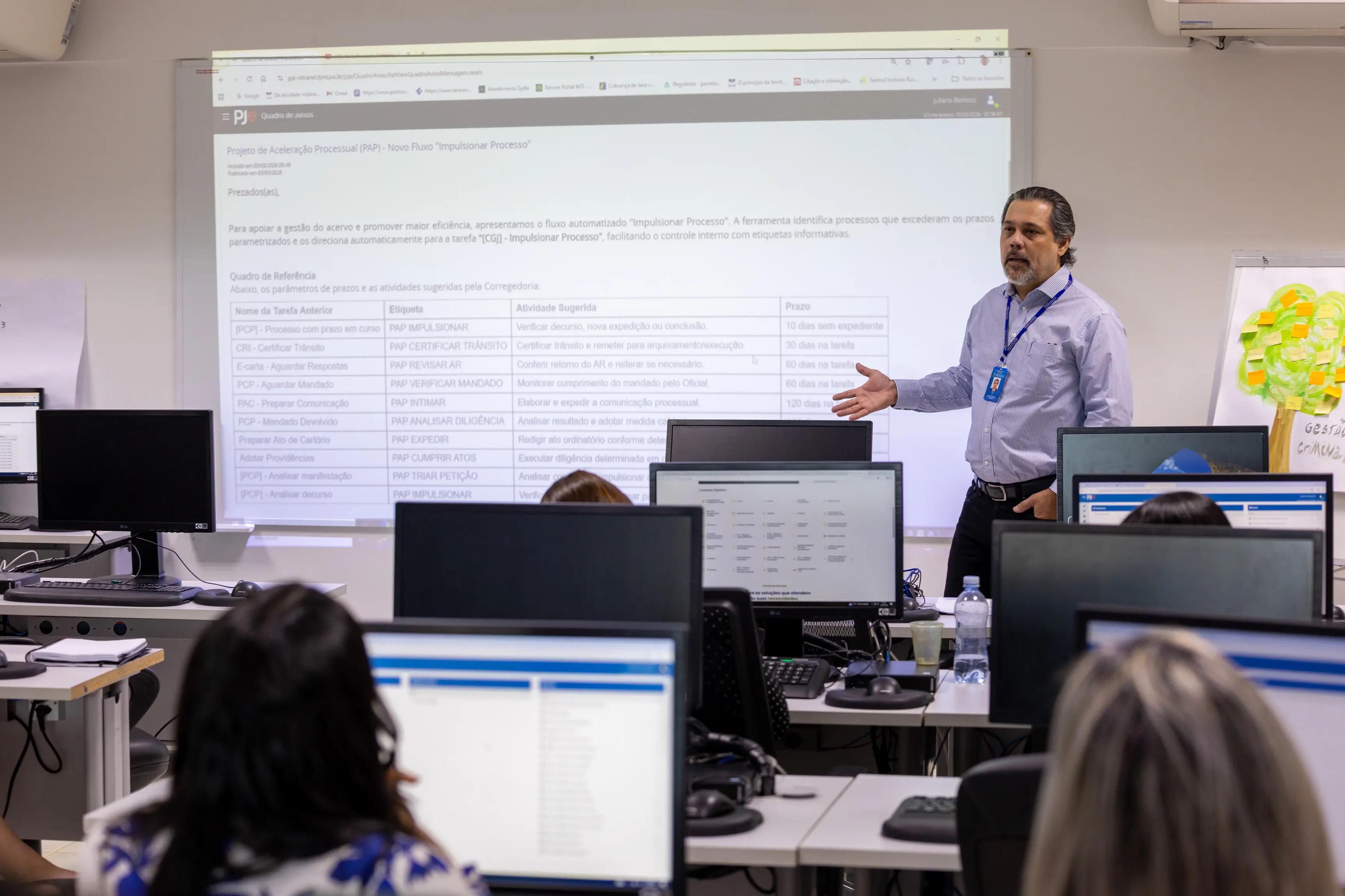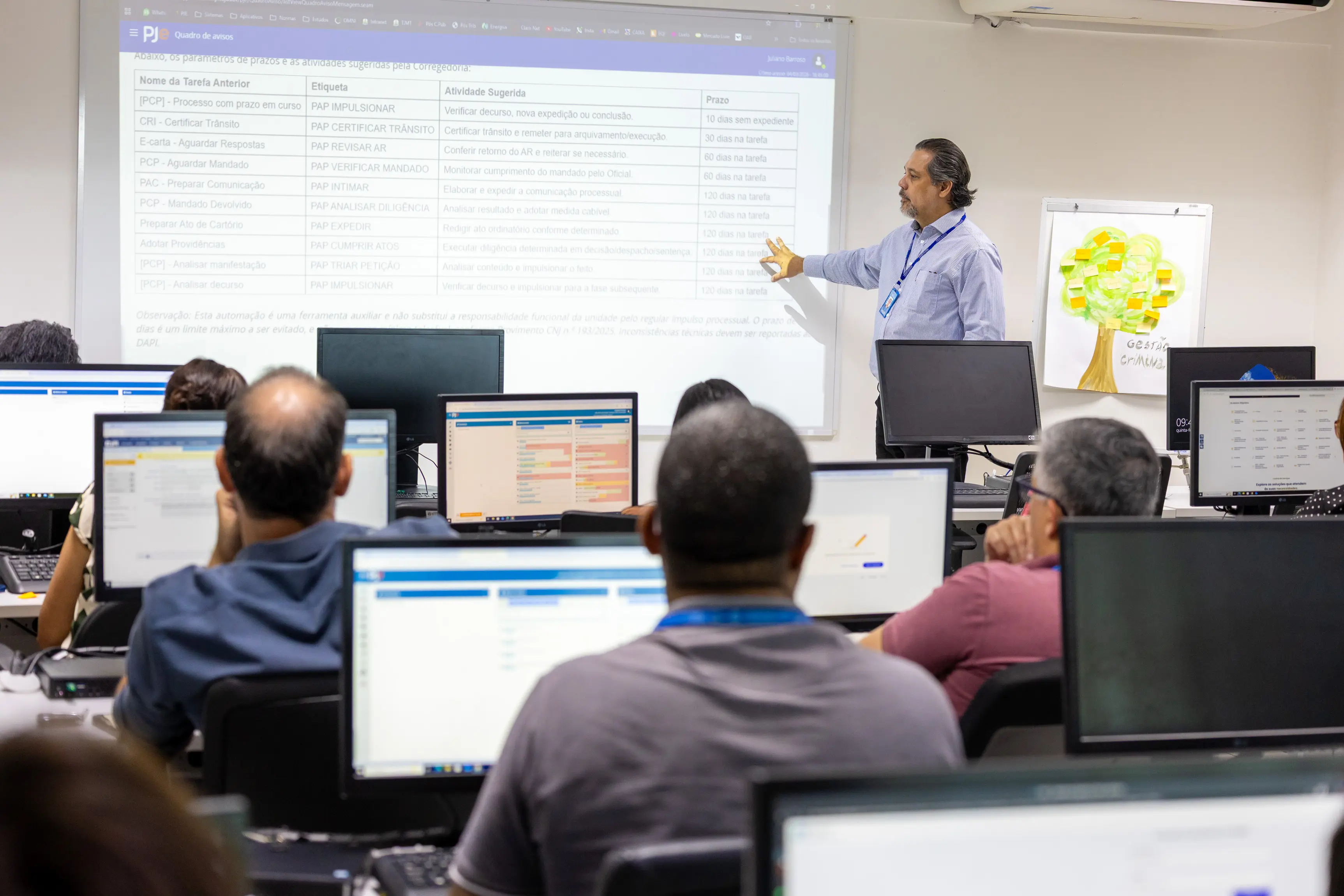 Um exemplo citado durante a capacitação foi o lançamento de informações em sistemas externos em casos de sentenças absolutórias, prática que muitas vezes continuava sendo feita por hábito, mesmo sem necessidade.