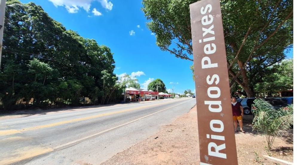 #PraTodosVerem– A imagem, capturada em um dia ensolarado, mostra uma paisagem às margens da MT-251, Rodovia Emanuel Pinheiro, com um foco proeminente em uma placa vertical de cor marrom, posicionada no lado direito, onde se lê em letras brancas a inscrição “Rio dos Peixes”. A estrada asfaltada, ladeada por terra batida, estende-se em perspectiva, com vegetação densa e árvores altas do lado esquerdo. Ao fundo, uma área comercial com algumas estruturas baixas e toldos vermelhos é visível, enquanto o céu é de um azul intenso com poucas nuvens. Uma pessoa está parcialmente visível à direita da placa, próxima a veículos estacionados sob a sombra das árvores.