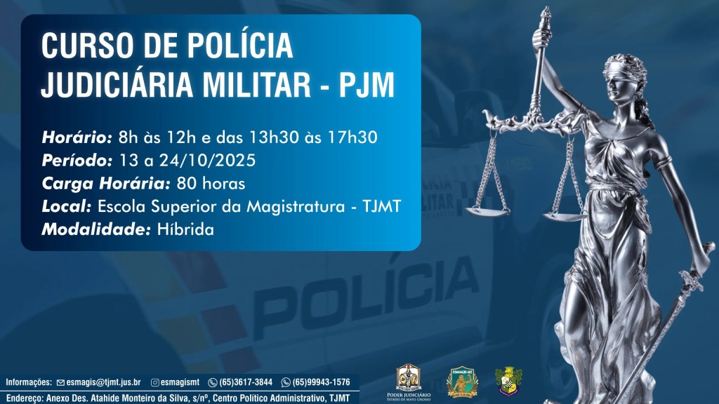 No dia 13 de outubro, a Escola Superior da Magistratura dará início ao Curso de Polícia Judiciária Militar, com um seminário de abertura que reunirá autoridades do Poder Judiciário e especialistas da Justiça Militar para debater temas relevantes à atuação policial e à jurisdição militar. A capacitação prosseguirá até o dia 24 de outubro.