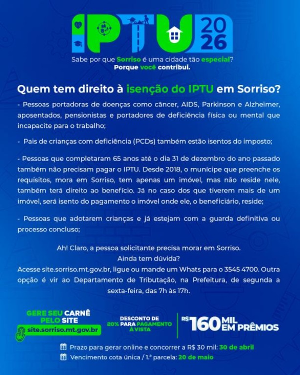 Ah! Lembre-se: o solicitante deve residir em Sorriso. O pedido de isenção deve ser renovado todo ano, por meio de um processo junto ao Departamento de Tributação.