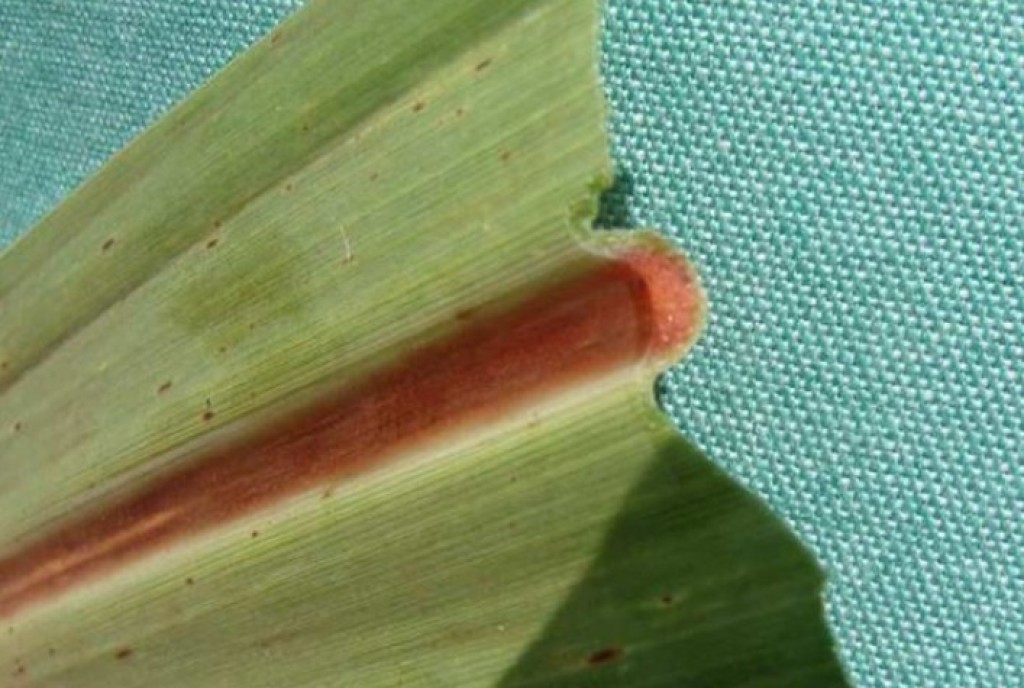 O primeiro sinal da SMC é o surgimento de lesões avermelhadas na nervura central das folhas. Diferentemente de outras doenças ou deficiências nutricionais, na SMC a coloração é completa quando observada em corte longitudinal da folha. Com chuva, os esporos do fungo atingem a bainha e iniciam a infecção, entupindo vasos condutores e reduzindo a absorção de água.