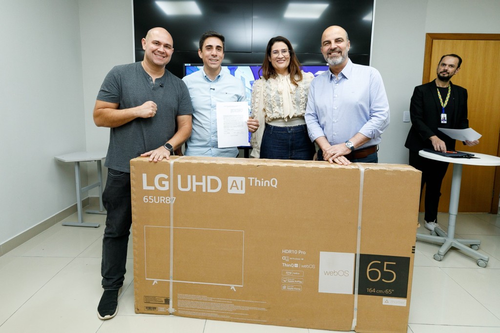 Na imagem principal o prefeito agradece ao secretário de estado Alan Porto, ao seu lado esquerdo e do lado direito está o secretário municipal Amauri Monge. No fundo estão amostras das TVs Smart de 65 polegadas.