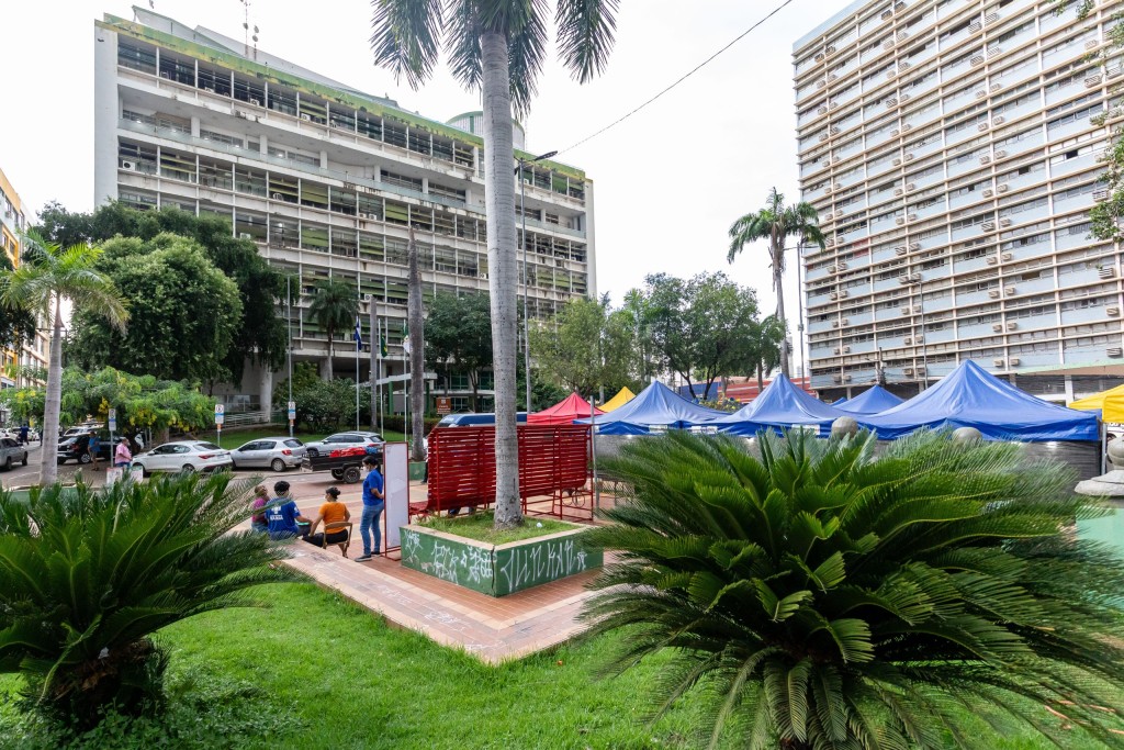 A imagem mostra a localização da Praça Alencastro, com as tendas dos feirantes. Ao fundo, o prédio da Prefeitura de Cuiabá e, na lateral, edifícios comerciais.