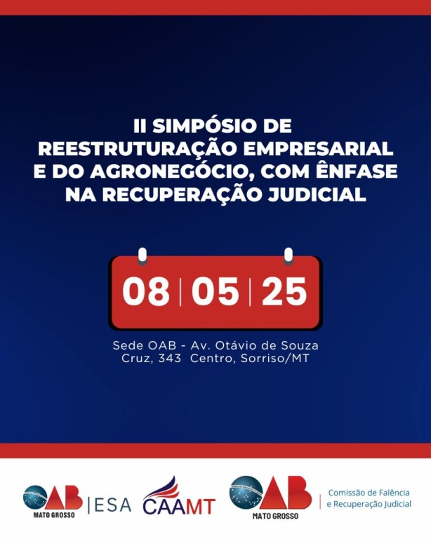 Pela segunda vez a Ordem dos Advogados do Brasil – Seccional Mato Grosso (OAB-MT), através da 17ª Subseção de Sorriso, estará oportunizando à advocacia um momento de grandes debates sobre a temática extremamente relevante para a região. O II Simpósio de Reestruturação Empresarial e do Agronegócio, com Ênfase na Recuperação Judicial, será realizado na próxima quinta-feira (8), na sede da OAB Sorriso, com três palestrantes convidados, todos eles magistrados reconhecidos pela atuação na área. O intuito é que levem aos participantes um olhar de dentro do Judiciário, sobre trâmites e implicações.