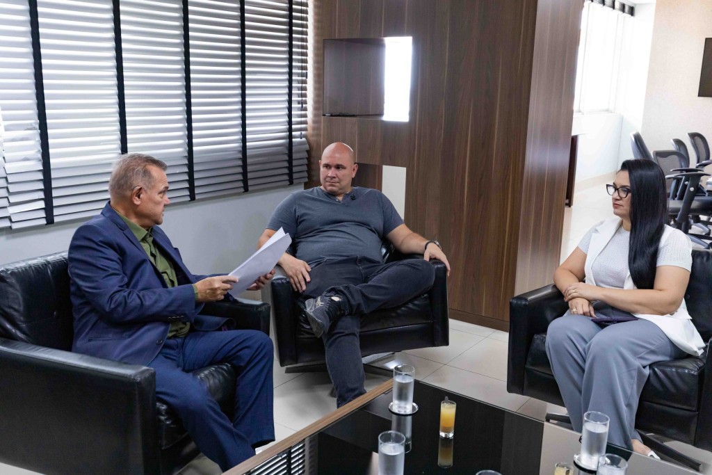 Na imagem principal o senador Fagundes, Abilio e Samanta, estão sentados, em reunião discutindo o projeto de lei. Fagundes está com o texto nas mãos, comunicando o gestor e a primeira-dama.