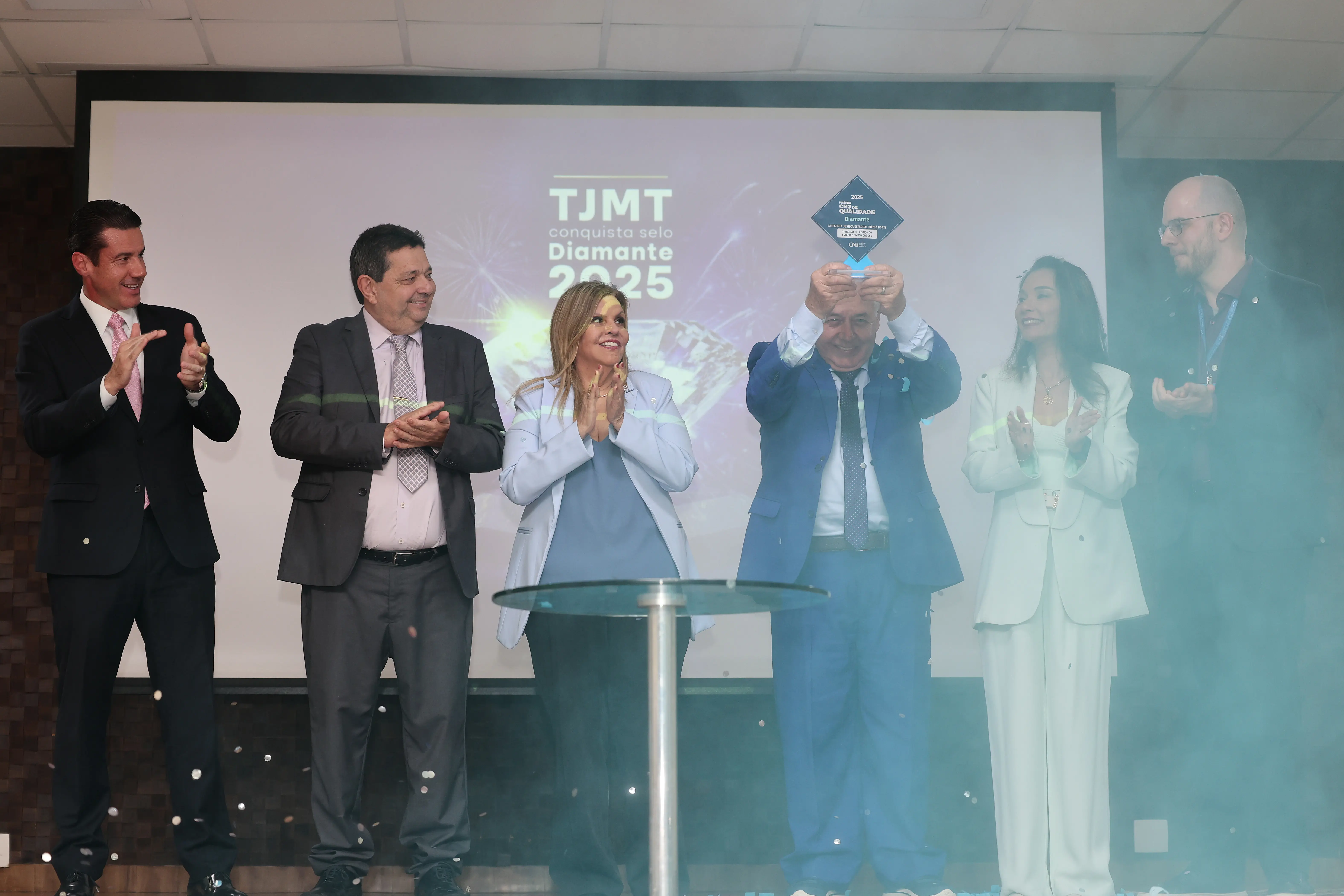Em ato simbólico, magistrados e servidores celebraram o Selo Diamante conquistado no Prêmio CNJ de Qualidade 2025 conquistado pelo Tribunal de Justiça de Mato Grosso (TJMT). Concedido pelo Conselho Nacional de Justiça (CNJ), a premiação reconheceu a eficiente atuação do Judiciário de Mato Grosso, o colocando entre os tribunais nacionais que melhor atendem a população.Na sexta-feira (5), o presidente do Judiciário mato-grossense, desembargador José Zuquim, apresentou o troféu recebido do CNJ, juntamente com a vice-presidente do TJMT, desembargadora Nilza Maria Pôssas de Carvalho, o corregedor-geral desembargador José Luiz Leite Lindote, e o ouvidor-geral desembargador Rodrigo Roberto Curvo.