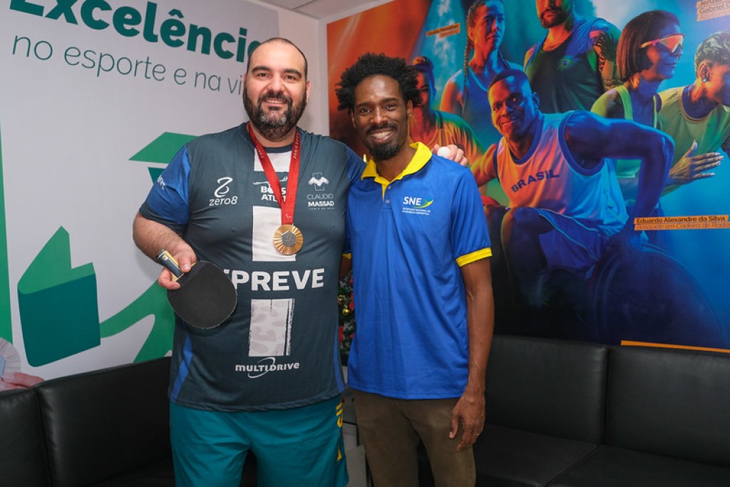 O mesa-tenista paralímpico Cláudio Massad desafiou os servidores da Secretaria Nacional de Excelência Esportiva (SNE), do Ministério do Esporte, em uma aula prática da modalidade na tarde da última sexta-feira (28). Além de interagir com os técnicos em uma partida de tênis, o atleta contou as dificuldades encontradas em sua trajetória esportiva e os benefícios e conquistas ao ingressar, em 2015, no Programa Bolsa Atleta e se tornar o 10º do mundo no individual e 4º nas duplas.
