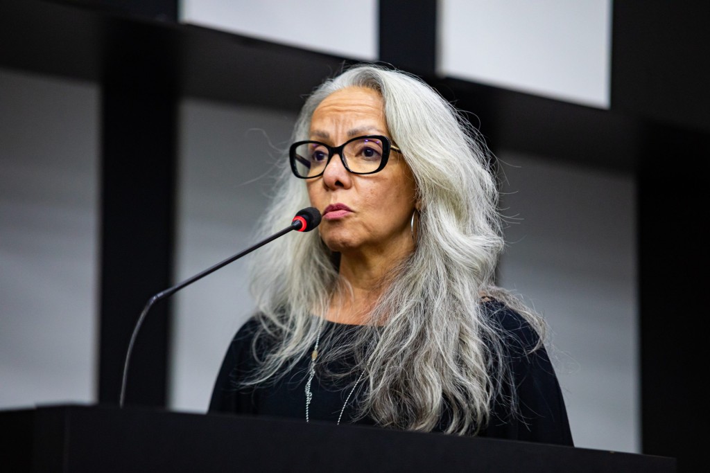 A imagem mostra a secretária municipal de Saúde durante um pronunciamento oficial. Ela usa óculos e veste roupas pretas.