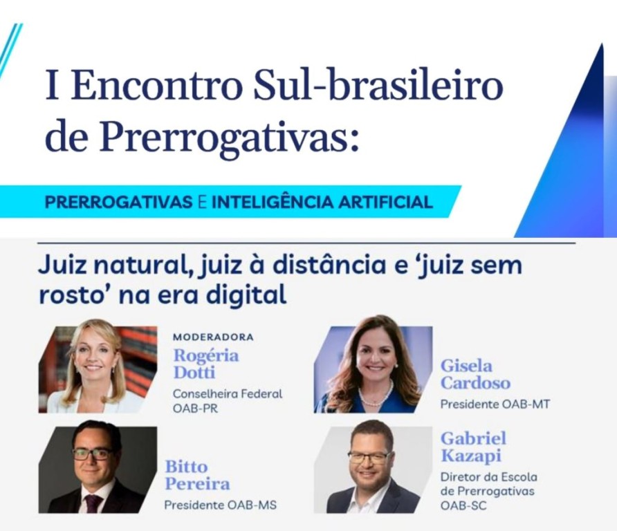 A presidente da Ordem dos Advogados do Brasil – Seccional Mato Grosso (OAB-MT), Gisela Cardoso, será uma das palestrantes do 1º Encontro Sul-Brasileiro de Prerrogativas, que acontece em Foz do Iguaçu (PR), quinta (19) e sexta-feira (20), tendo como tema central “Prerrogativas e IA”. Os desafios da advocacia diante das novas tecnologias e da inteligência artificial no sistema de Justiça serão debatidos durante painéis com a participação de lideranças da advocacia de todo o Brasil. A presidente da OAB-MT, Gisela Cardoso, será uma das palestrantes no painel “Juiz natural, juiz à distância e ‘juiz sem rosto’ na era digital”, ao lado do presidente da OAB-MS, Bitto Pereira, da diretora da Escola Superior da Advocacia do Paraná, Maíra Fonseca, e do Diretor da Escola de Prorrogativas da OAB-SC, Gabriel Kazapi.