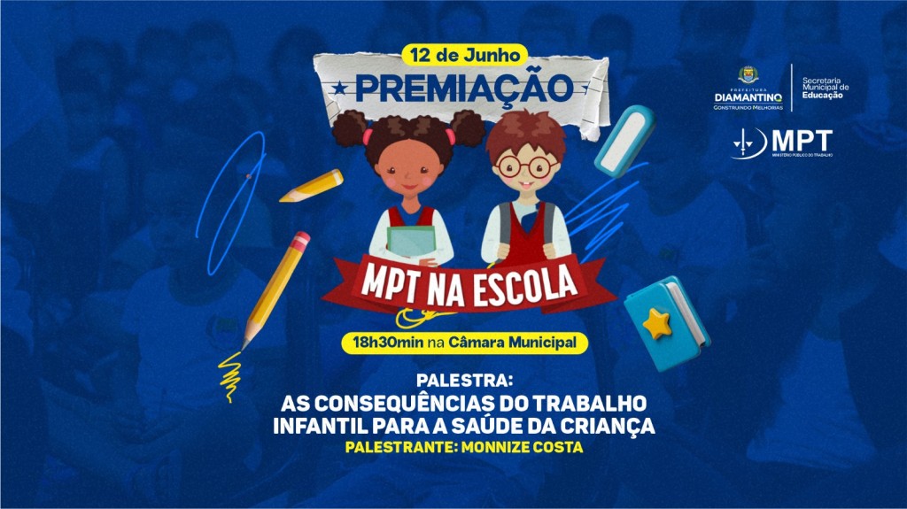 No dia 12 de junho acontecerá a premiação do Projeto MPT na Escola, uma ação voltada à prevenção e ao combate ao trabalho infantil. Uma iniciativa do Ministério Público do Trabalho, em parceria com a Prefeitura de Diamantino, por meio da Secretaria Municipal de Educação.