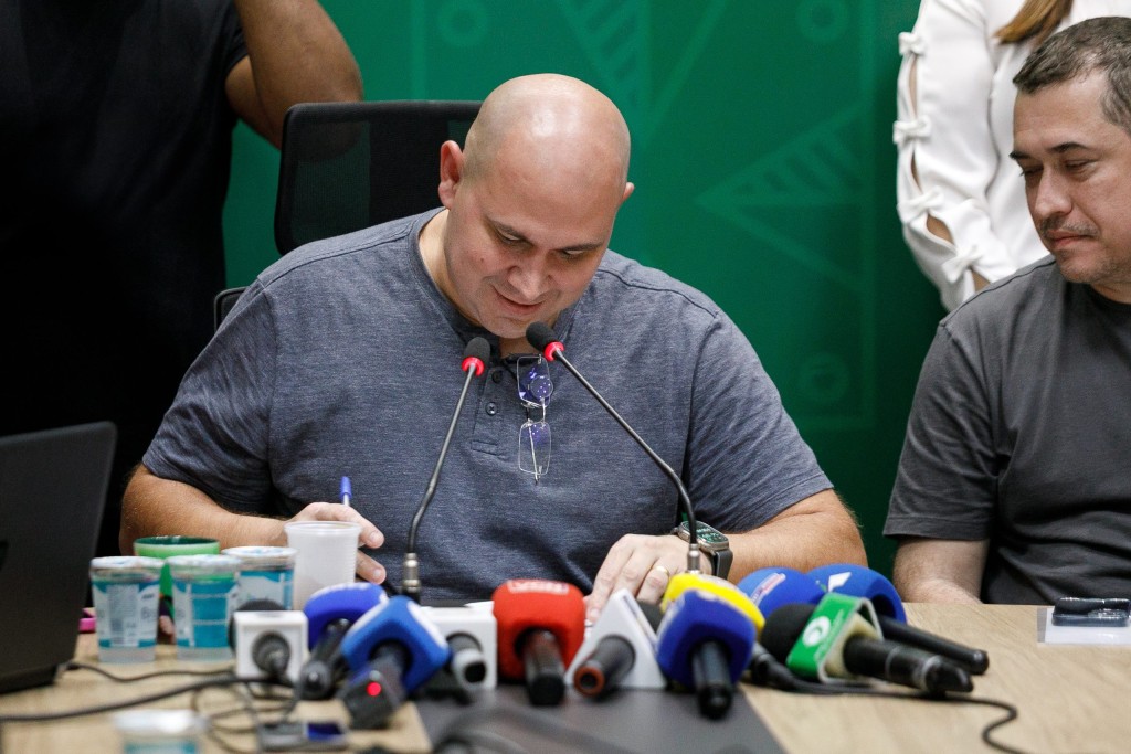 A foto exibe o prefeito Abilio Brunini assinando um documento à caneta. Ao lado, está o secretário de Economia, Marcelo Bussiki. Ambos vestem camisa cinza, estão sentados e apoiados numa mesa da qual são exibidos microfones de emissoras de TV.