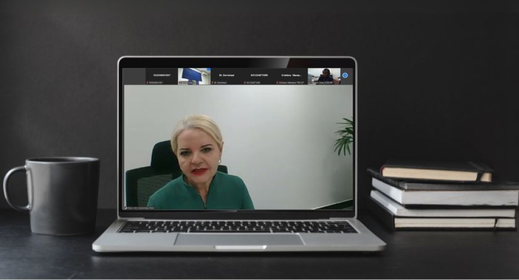 #PraTodosVerem – A imagem mostra um notebook sobre uma mesa escura, ao lado de uma caneca preta e uma pilha de livros. Na tela do computador, está ocorrendo uma videoconferência. A tela mostra a desembargadora Serly Marcondes Alves, presidente do TRE-MT, trajando blusa verde, sentada diante de uma parede clara com uma planta ao fundo. A interface da videoconferência indica que há outros participantes conectados na parte superior da tela.