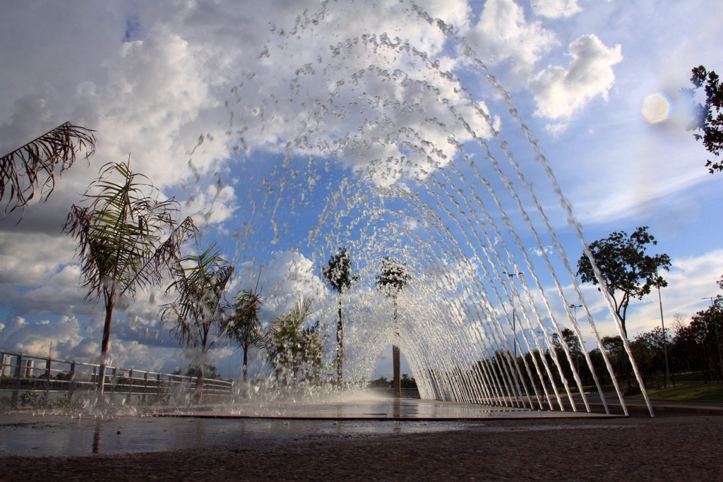 A foto mostra o Parque das Águas, com uma fonte em formato de água ligada.