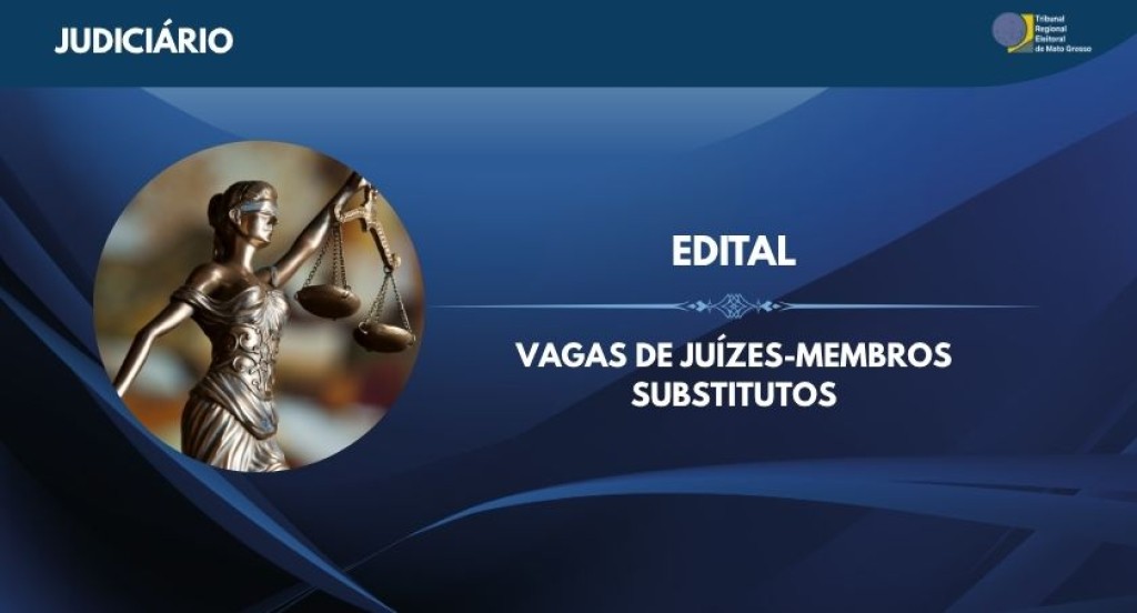 #PraTodosVerem: A imagem apresenta um banner institucional com fundo em tons de azul e o título “EDITAL – VAGAS DE JUÍZES-MEMBROS SUBSTITUTOS” em destaque ao centro. No canto superior esquerdo, lê-se a palavra “JUDICIÁRIO”, e no canto superior direito está o logotipo do Tribunal Regional Eleitoral de Mato Grosso. À esquerda, há uma imagem circular com a escultura da deusa da justiça, representada com uma balança na mão e olhos vendados, símbolo da imparcialidade do Judiciário.